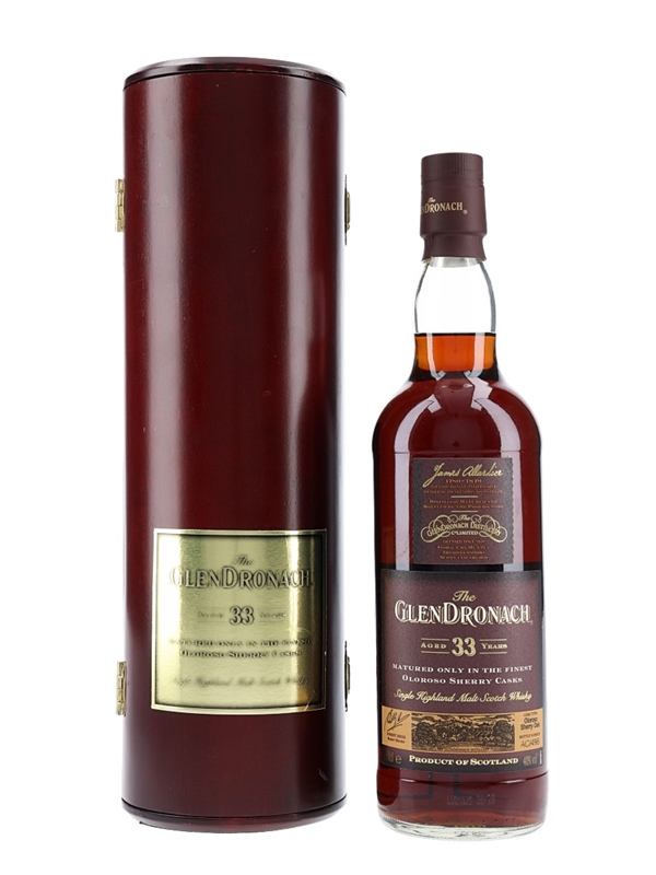 A bottle of Glendronach 33 Year Old Single Malt Scotch Whisky. This was matured in oloroso sherry casks and bottled at 40% ABV.