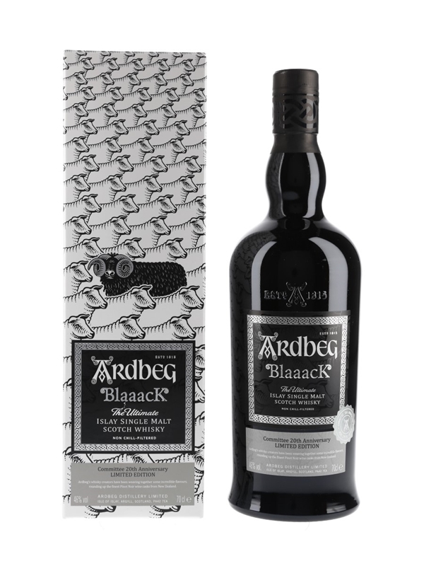 A limited edition bottle of Ardbeg Blaaack The Ultimate Islay Single Malt Scotch Whisky, matured in Pinot Noir barrels from New Zealand. This was bottled to commemorate the Ardbeg Committee's 20th Anniversary in 2020.