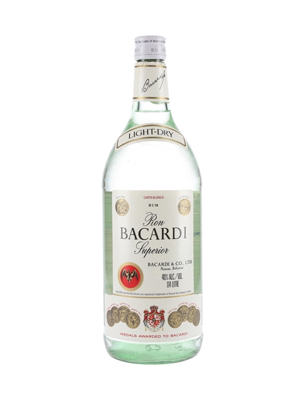 A 114cl bottle of Bacardi Carta Blanca Superior Light Dry Rum, produced in Nassau, Bahamas. We estimate this was bottled in the 1980s.