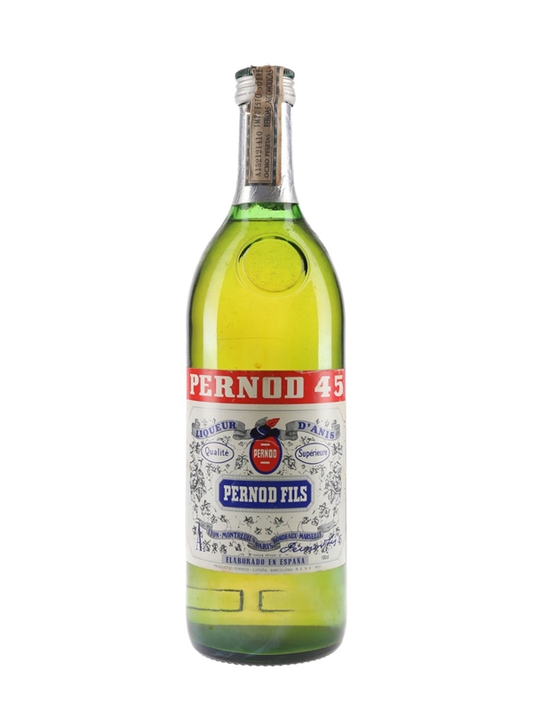 A litre bottle of Pernod 45 anise liqueur produced in Spain, we estimate in the 1970s.