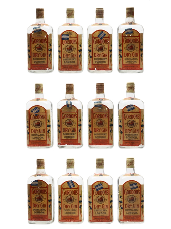 This lot contains twelve bottle of Gordon's Dry Gin distilled and bottled in London by Tanqueray, Gordon & Co. Ltd., sealed with spring cap closures and presented in the original wooden branded crate. These were supplied to US Navy Mess. We estimate these were bottled in the 1950s.