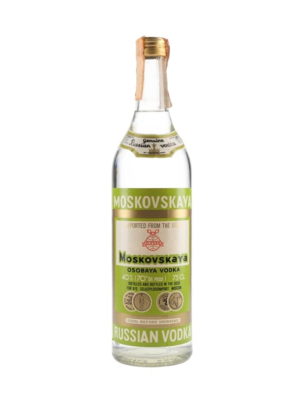 A bottle of Moskovskaya Osobaya Genuine Russian vodka, produced and bottled in the USSR for Sojuzplodoimport. This was imported to Italy by F.lli Averna, we estimate in the 1980s.