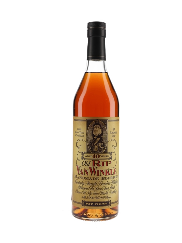 A bottle of Old Rip Van Winkle 10 Year Old Handmade Bourbon, distilled, aged and bottled by Old Rip Van Winkle Distillery, Frankfort.