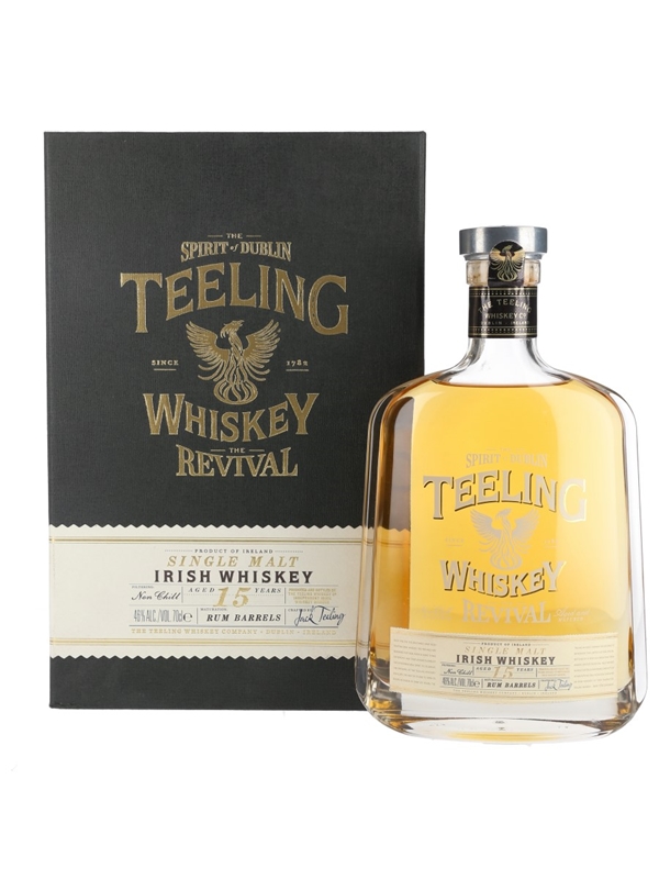 A bottle of Teeling 15 Year Old Irish Single Malt Whiskey, matured exclusively in ex rum barrels. This is the first edition in the Whiskey Revival series.