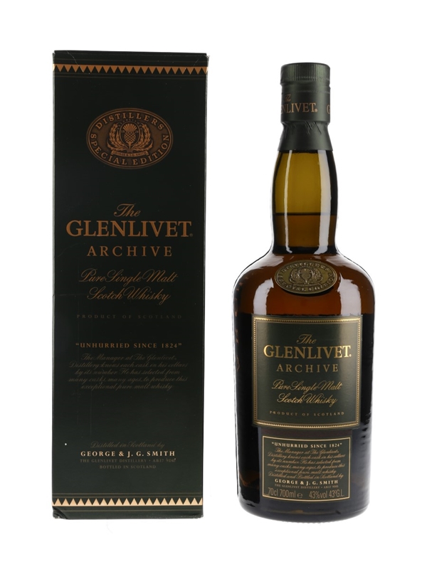 A bottle of The Glenlivet Archive Pure Single Malt Scotch Whisky, a bottling of casks selected by distillery manager Jim Cryle from the distillery's Archive.