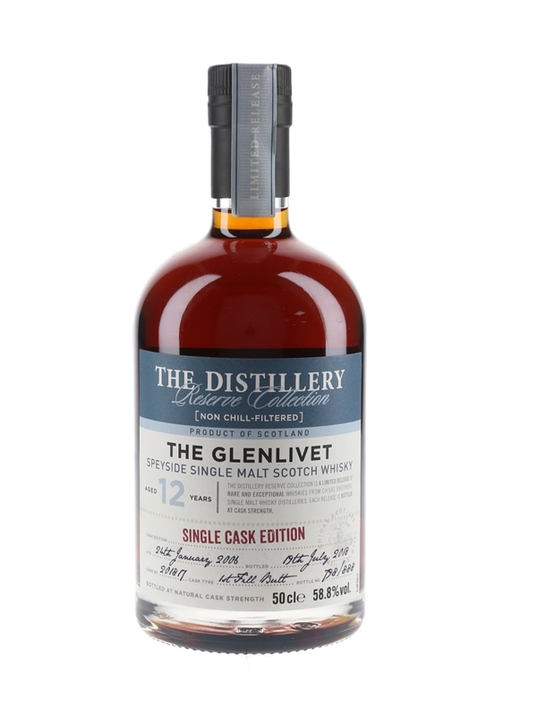 A bottle of Glenlivet 12 Year Old Single Malt Scotch Whisky. This was distilled on 24 January 2006, matured in a first fill butt and bottled at cask strength on 19 July 2018 by Chivas Brothers for the The Distillery Reserve Collection series.