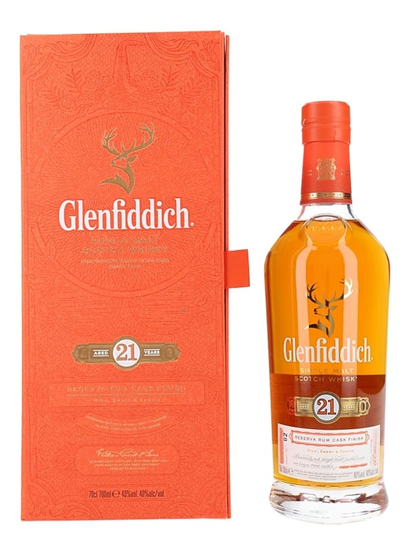 A bottle of Glenfiddich 21 Year Old Reserva Rum Cask Finish Single Malt Scotch Whisky in a presentation box. This was matured for four months in rum casks before bottling.