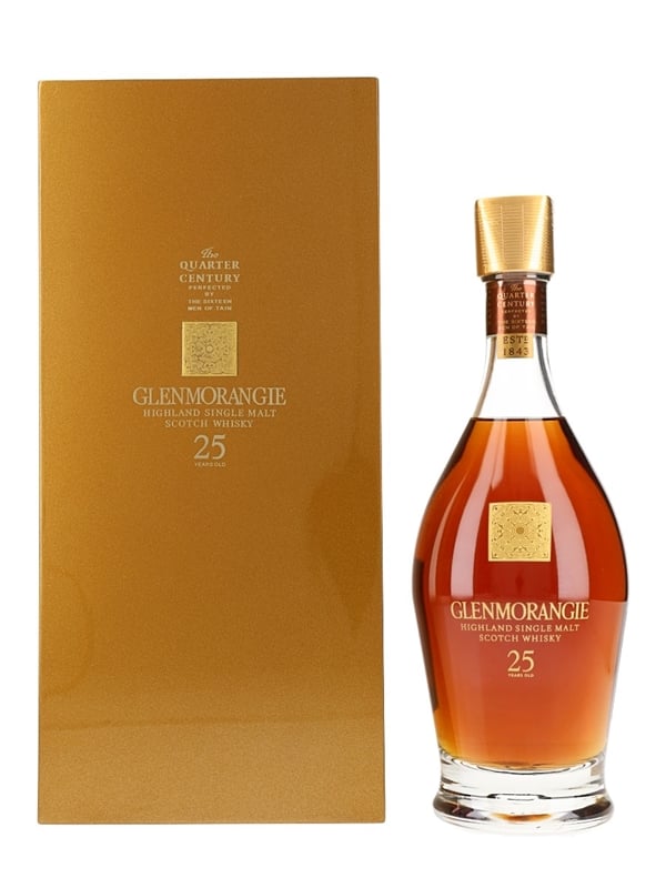 A bottle of Glenmorangie 25 Year Old, The Quarter Century, in a presentation box. This whisky was matured in a combination of bourbon barrels, sherry butts, and Burgundy wine casks.