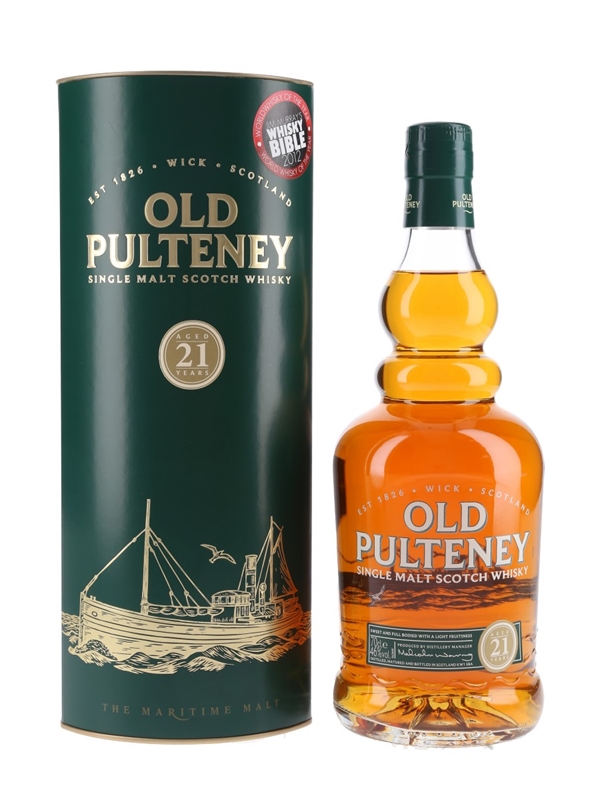 A bottle of Old Pulteney 21 Year Old Single Malt Scotch Whisky.