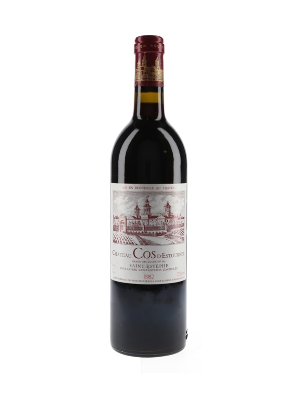 A bottle of 1982 Château Cos d'Estournel, a 'super second' growth in the 1855 Classification, from the Saint-Estèphe appellation in Bordeaux.