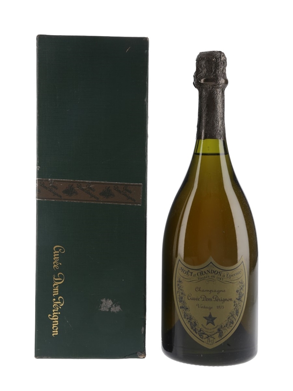A bottle of 1973 Dom Pérignon vintage Champagne from Möet & Chandon, a blend of 50% Pinot Noir and 50% and 50% Chardonnay.