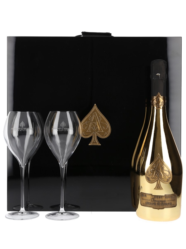 A bottle of Armand de Brignac 'Ace of Spades' Brut Gold Champagne presented in a lacquered black box with two glass flutes.