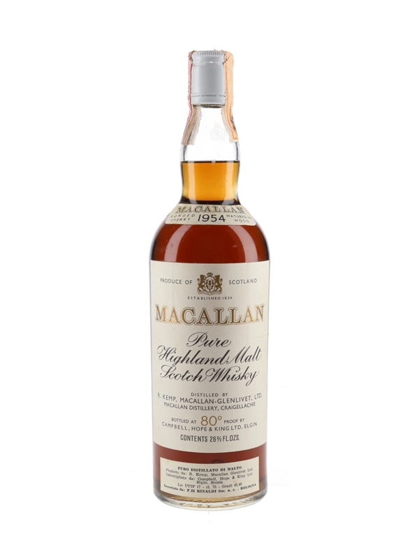A bottle of The Macallan 1954 Pure Highland Pure Malt Scotch Whisky, bottled by Campbell, Hope & King. This was imported to Italy by Rinaldi, we estimate in the 1970s.