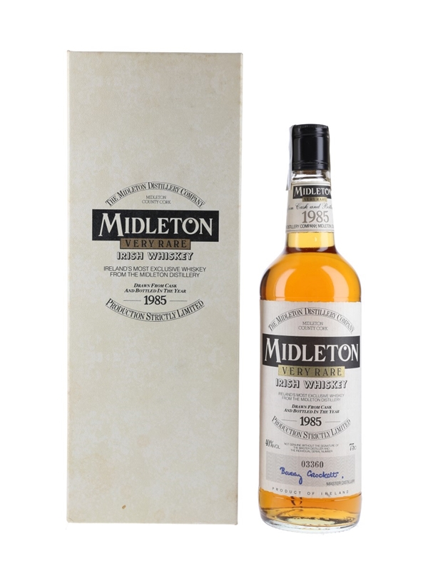 A bottle of Midleton Very Rare Irish Whiskey drawn from cask and bottled in 1985. Every year since 1984, a new release has been produced and bottled in limited quantities.