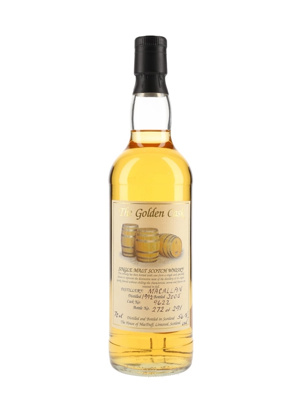A bottle of Macallan 1992 Single Malt Scotch Whisky. This was bottled from a single cask in 2005 by House of MacDuff for The Golden Cask series.