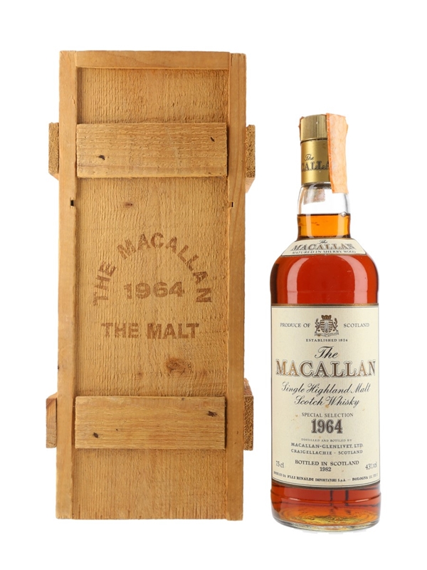 A bottle of The Macallan 1964 Single Highland Malt Scotch Whisky, matured in sherry casks and bottled in 1981. This was bottled for the Italian imported by Rinaldi.