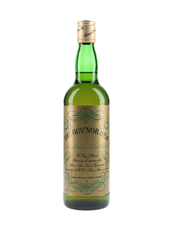 A bottle of The Guv'nor Ben Special Blend Scotch Whisky, selected by the directors of the Adams Super Service Organisation.