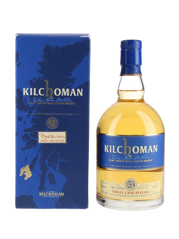 A bottle of Kilchoman Single Cask Release Islay's Farm Distillery Single Malt Scotch Whisky. This was distilled on 22 May 2007, matured in a single bourbon cask and bottled on 4 June 2010 at 61.7% ABV for Royal Mile Whiskies.