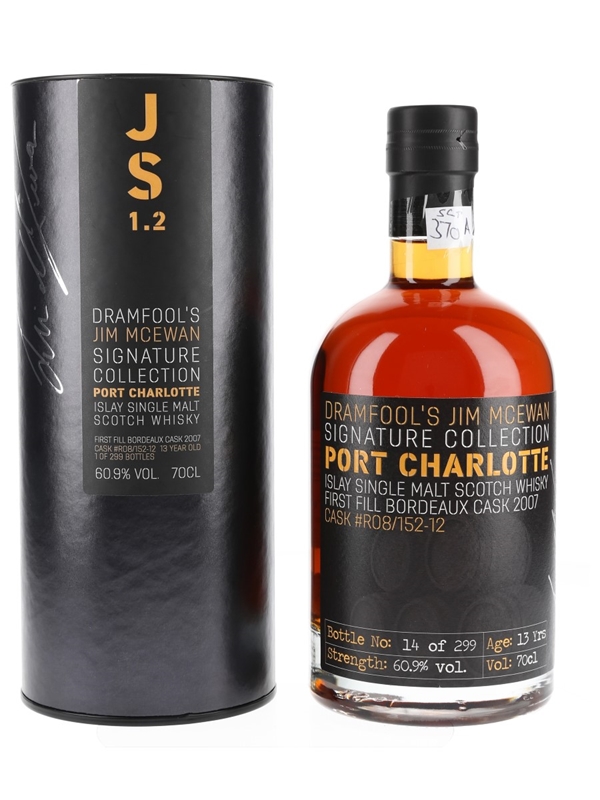 A bottle of Port Charlotte 13 Year Old 2007 Dramfool's Jim McEwan Signature Collection matured in a first fill Bordeaux cask and bottled at 60.9%