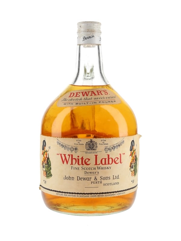 A magnum bottle of Dewar's White Label Finest Scotch Whisky. This bottle has a handle and a built-in pourer for easy serving. We estimate this was bottled in the 1970s.