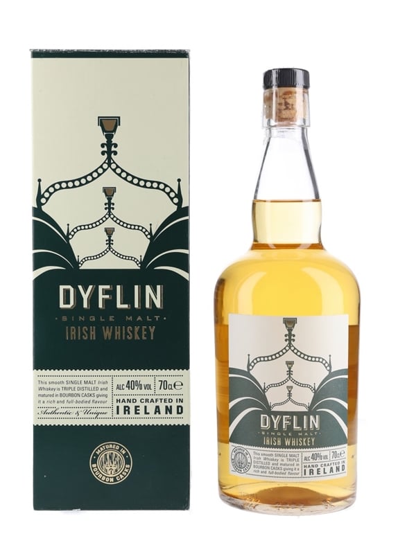 A bottle of Dyflin Single Malt Irish Whiskey, tripled distilled and matured in bourbon casks.