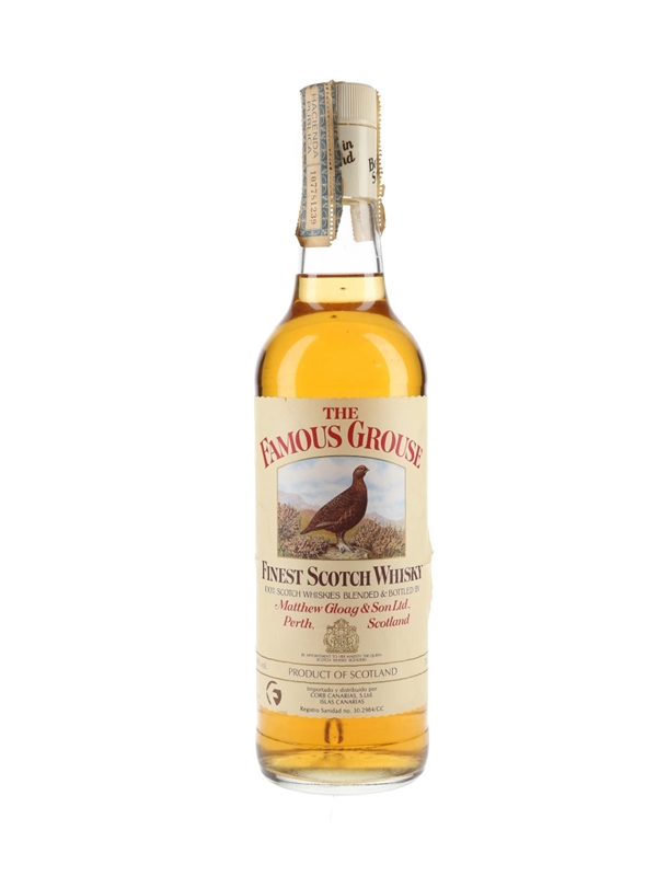 A bottle of The Famous Grouse Finest Scotch Whisky, blended and bottled by Matthew Gloag & Son Ltd. This was imported to the Canary Islands by Corb Canarias, we estimate in the 1990s.