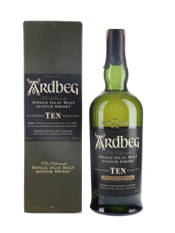 A bottle of Ardbeg 10 Year Old The Ultimate Single Islay Malt Scotch Whisky. The bottling code indicates this was bottled in 2002. This was imported to Italy by Velier.