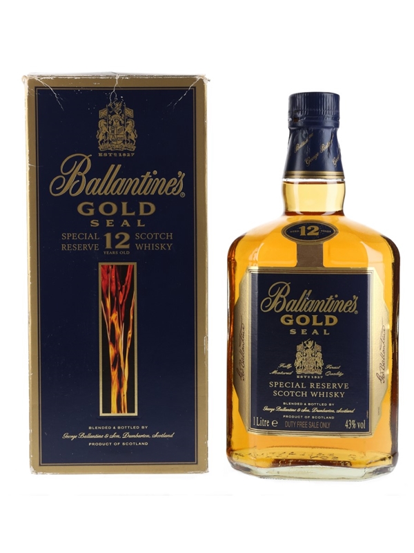 A litre bottle of Ballantine's Gold Seal 12 Year Old blended Scotch whisky, produced by George Ballantine & Son. This was bottled for the duty free market, we estimate in the 1990s.