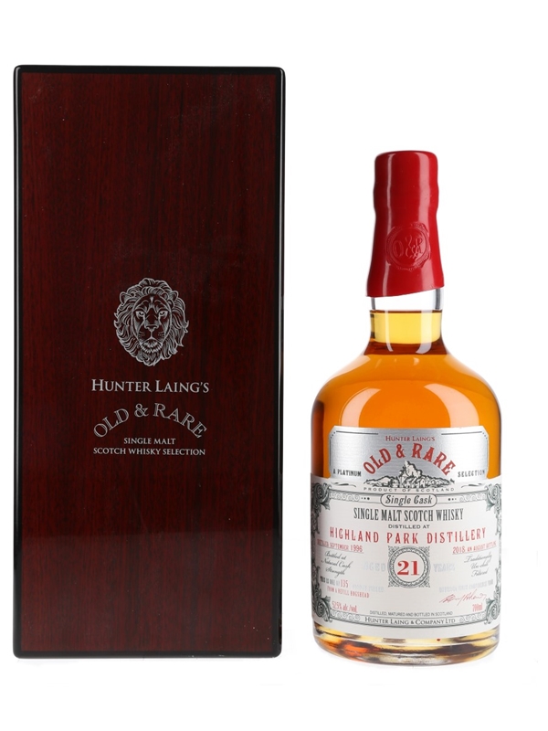 A bottle of Highland Park 21 Year Old Single Cask Single Malt Scotch Whisky. This was distilled in September 1996, matured in a single refill hogshead and bottled at a natural cask strength of 52.5% ABV in August 2018 for Hunter Laing's Old & Rare Platinum Selection series.
