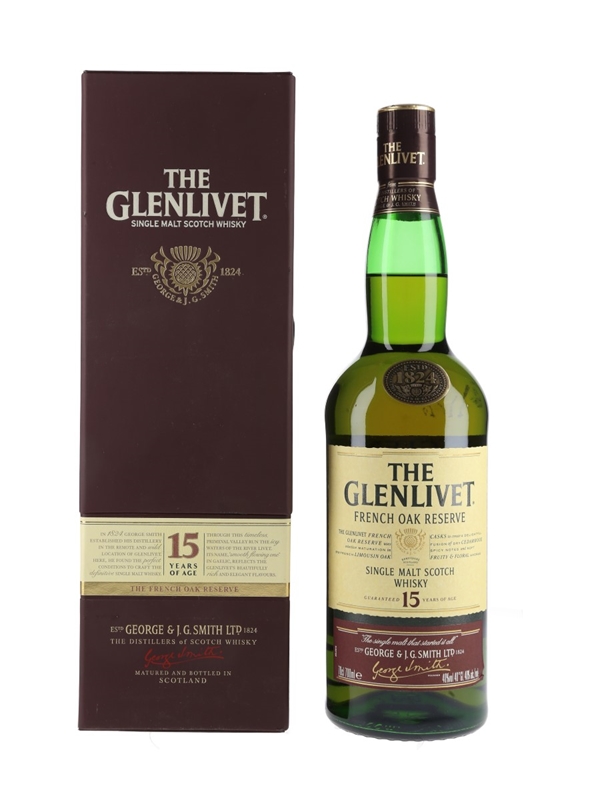 A bottle of The Glenlivet 15 Year Old French Oak Reserve Single Malt Scotch Whisky in a presentation box. This whisky was matured in Limousin oak casks. The bottling code indicates this was bottled in 2010.