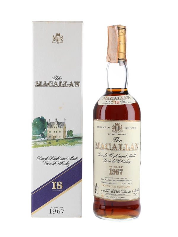 A bottle of The Macallan 18 Year Old Single Highland Malt Scotch Whisky, distilled in 1967 and matured in sherry casks. This was bottled for the Italian market and imported by Giovinetti, we estimate in the 1980s.