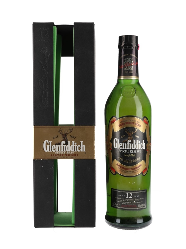 An old presentation bottle of Glenfiddich 12 Year Old Special Reserve Fine Aged Special Reserve Pure Single Malt Scotch Whisky.
