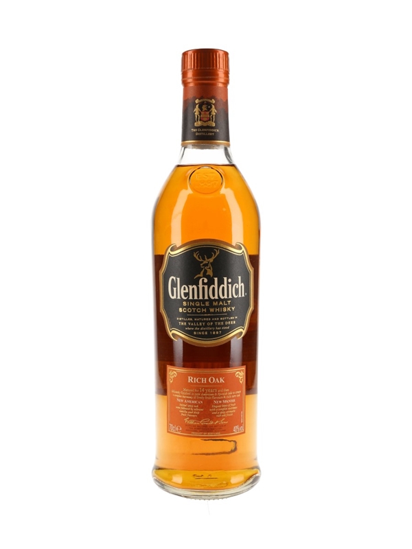 A bottle of Glenfiddich Rich Oak 14 Year Old Single Malt Scotch Whisky, first released in spring 2010. This spent 14 years in ex-bourbon casks before two separate finishes of 12 weeks in new Spanish oak and six weeks in new American oak before bottling.