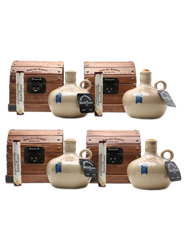 This case contains four ceramic jugs of Isla del Tesoro Extra Añejo rum from Santiago de Cuba. Isla del Tesoro Extra Añejo is a blended rum aged for a minimum of 20 years, and each jug is presented in a wooden treasure chest and a hessian bag.