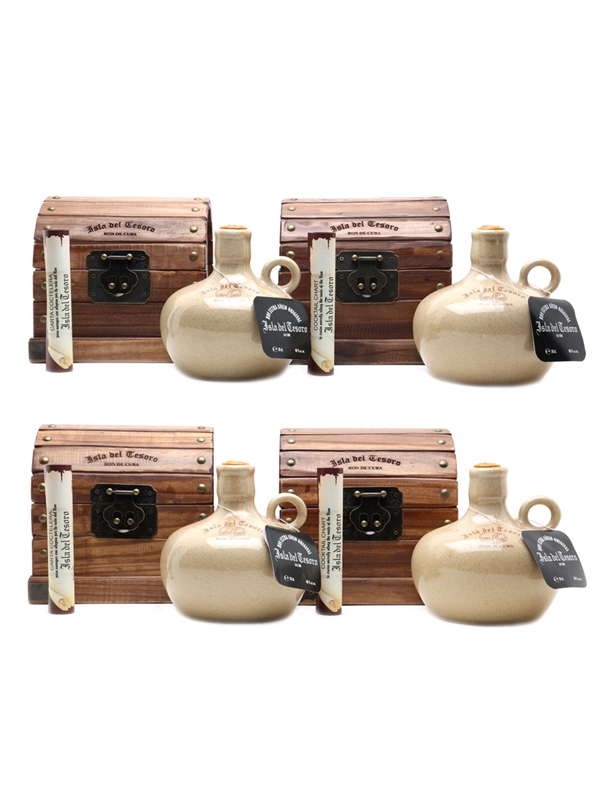 This case contains four ceramic jugs of Isla del Tesoro Extra Añejo rum from Santiago de Cuba. Isla del Tesoro Extra Añejo is a blended rum aged for a minimum of 20 years, and each jug is presented in a wooden treasure chest and a hessian bag.
