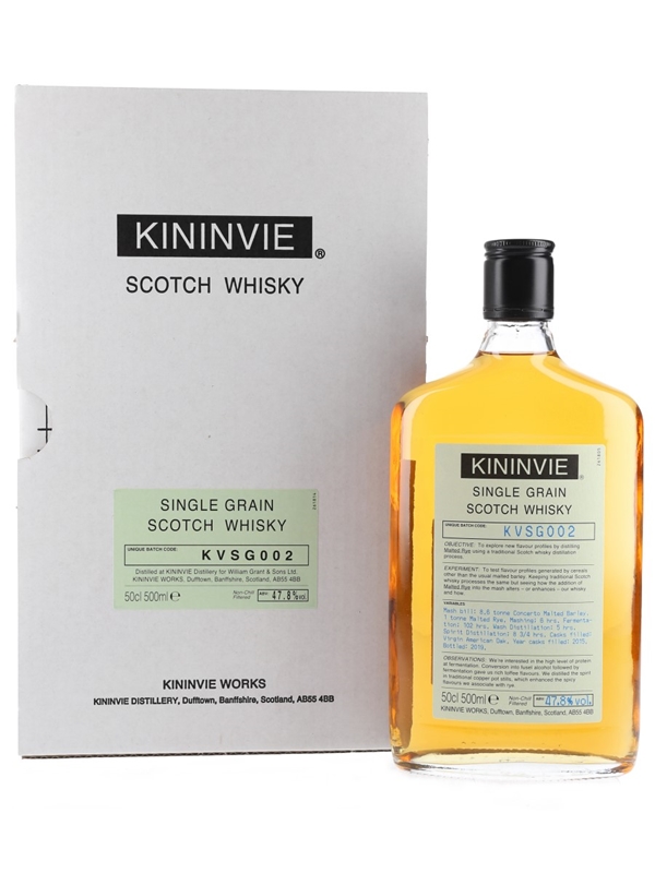 A 50cl trade sample of Kininvie Single Grain Scotch Whisky. This was distilled in 2015, matured in virgin American casks and bottled in 2019. The front label carries a list of details about the whole production process of this whisky.