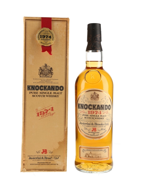 A bottle of Knockando 1974 Pure Single Malt Scotch Whisky. This was distilled in 1974 and bottled in 1987 by distillery proprietors Justerini & Brooks.