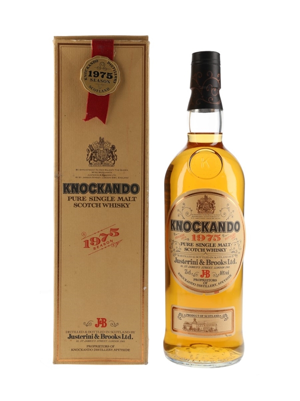 A bottle of Knockando Pure Single Malt Scotch Whisky that was distilled in 1975 and bottled in 1987 by Justerini & Brooks.