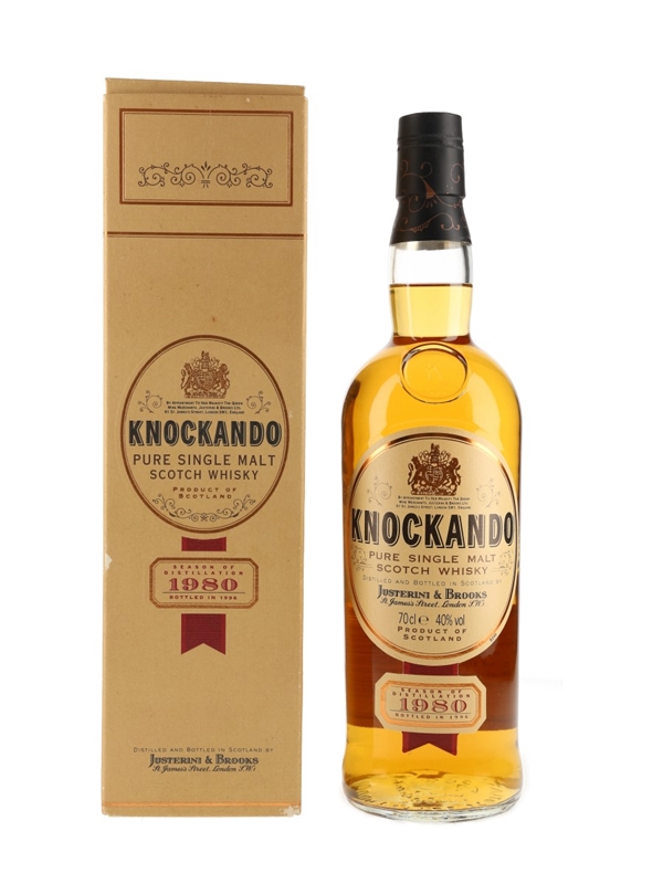 A bottle of Knockando Pure Single Malt Scotch Whisky, distilled by Justerini & Brooks in 1980 and bottled in 1996.