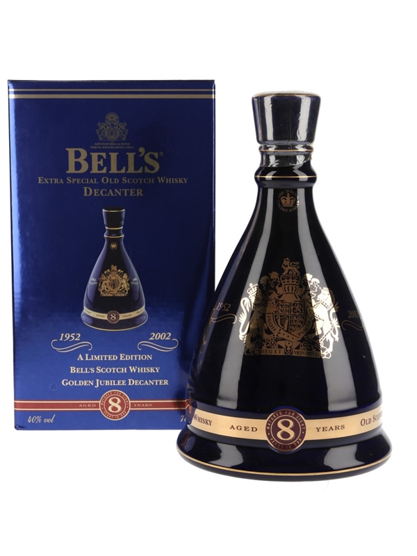 A blue ceramic decanter from Wade containing Bell's 8 Year Old blended Scotch whisky, which was released to celebrate the golden jubilee of Queen Elizabeth II in 2002.