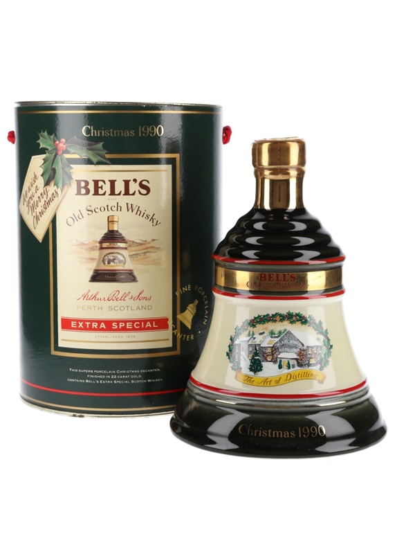 A bottle of Bell's Old Scotch Whisky presented in a ceramic decanter and released for Christmas 1990. The label depicts 'The Art of Distilling' with Blair Athol distillery blanketed in snow.