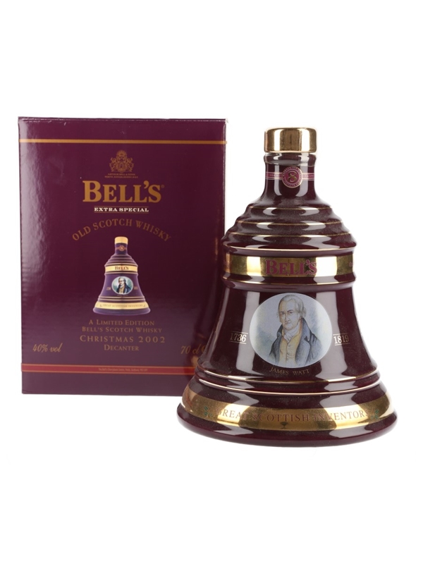 A ceramic decanter of Bell's Old Scotch Whisky released for Christmas 2002. This contains Bell's Extra Special 8 Year Old whisky. This decanter is dedicated to the great Scottish inventor James Watt.