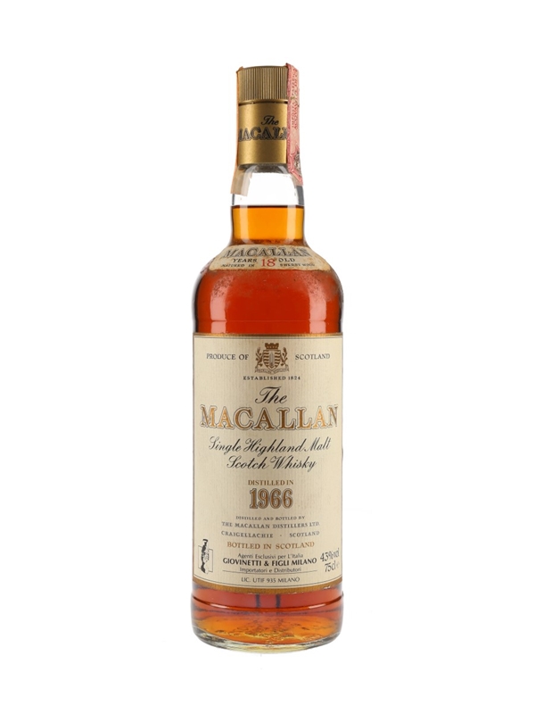 A bottle of The Macallan 18 Year Old Single Highland Malt Scotch Whisky. This was distilled in 1966, matured in sherry casks and bottled for Italian importer Giovinetti & Figli.