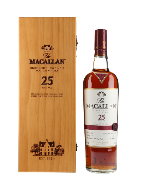 A bottle of The Macallan 25 Year Old Highland Single Malt Scotch Whisky, exclusively matured in hand crafted sherry oak casks from Jerez, Spain.
