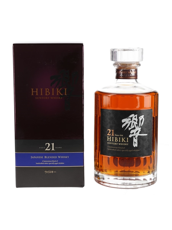 A bottle of Hibiki 21 Year Old Suntory Japanese Blended Whisky, imported to the UK by Beam Suntory UK Ltd.