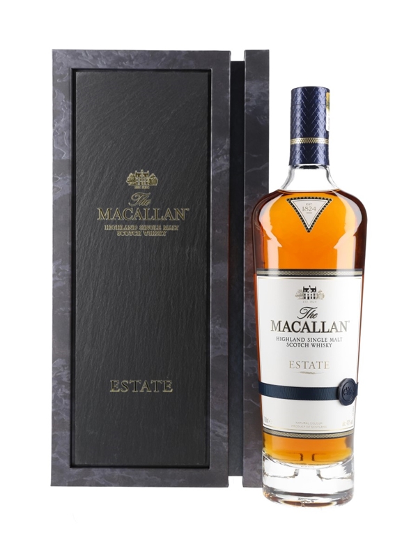 A bottle of The Macallan Estate Highland Single Malt Scotch Whisky, released in 2019. This expression contains a portion of spirit made from barley grown on the Macallan estate, situated on the banks of the river Spey. The estate-grown barley is distilled for just one week per year.