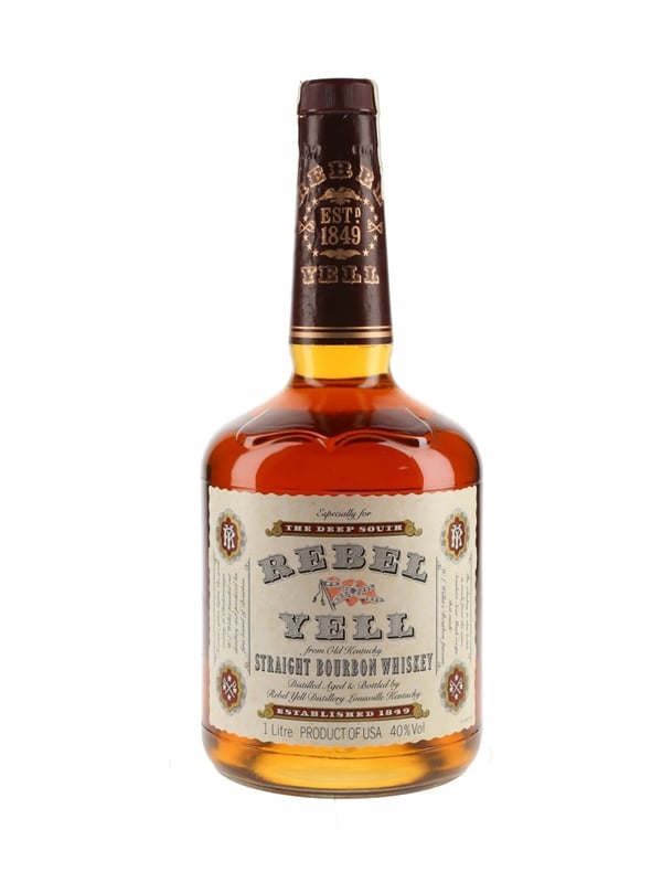 A bottle of Rebel Yell Kentucky Straight Bourbon Whiskey. This whiskey takes its name from the battle cry used by Confederate soldiers during the American Civil War. The Billy Idol song 'Rebel Yell' is named after this whiskey. We estimate this was bottled in the early 1990s.