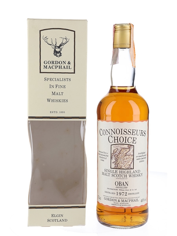 A bottle of Oban Single Highland Malt Whisky, distilled in 1972. This was bottled by Gordon & MacPhail as part of the Connoisseurs Choice series and imported to Italy by Donini, we estimate in the 1990s.