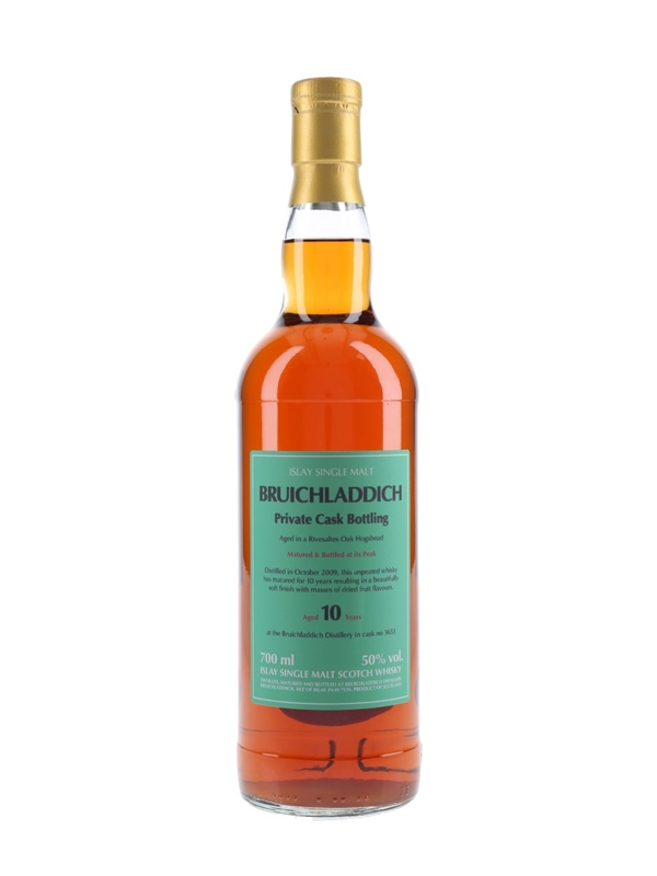 A private cask bottling of Bruichladdich 10 Year Old Islay Single Malt Scotch Whisky. This unpeated whisky was distilled in October 2009, matured in a single Rivesaltes hogshead and bottled at 50% ABV.