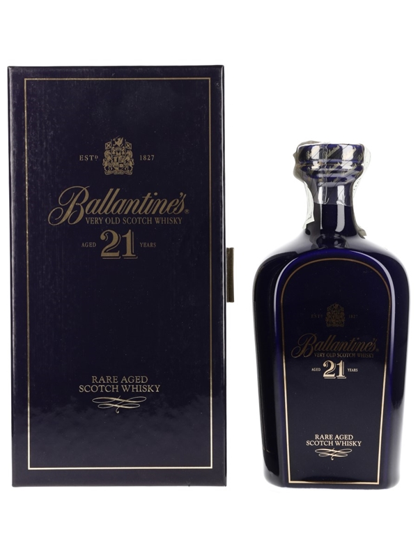 A bottle of Ballantine's 21 Year Old Rare Aged Scotch Whisky presented in a blue ceramic Wade decanter decorated with 22 carat gold.
